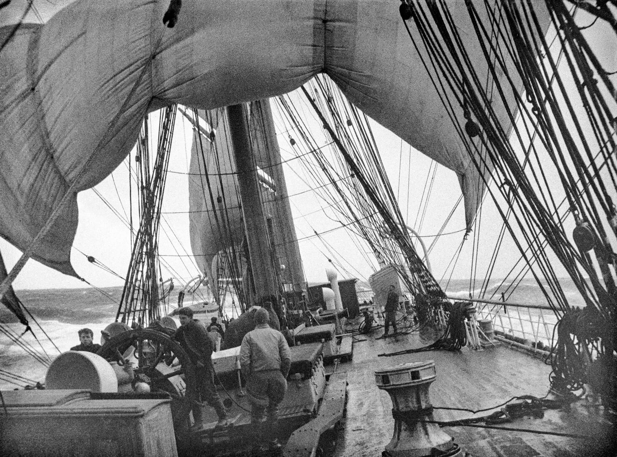 βDe voortjagende romp trilde door een witte schuimende chaos. Verbijsterd hing ik daar, duizelig en doorweekt, mee trillend met het schip. Onder vol tuig, rukkend aan haar roer, twee, drie, vier roergangers worstelden om haar op koers te houden. Ze vloog door de nacht, een kielzog van een mijl achter zich aan slepend.β Een citaat uit De laatste reis van de Herzogin van Pamela Eriksson. β¨Zo erg is het op deze foto niet. Met twee man aan het roer en met de handen in de zakken kun je nog op het dek staan. De golven van achteren maakten wel dat het schip rolde en het roer toch aardig kon bokken.