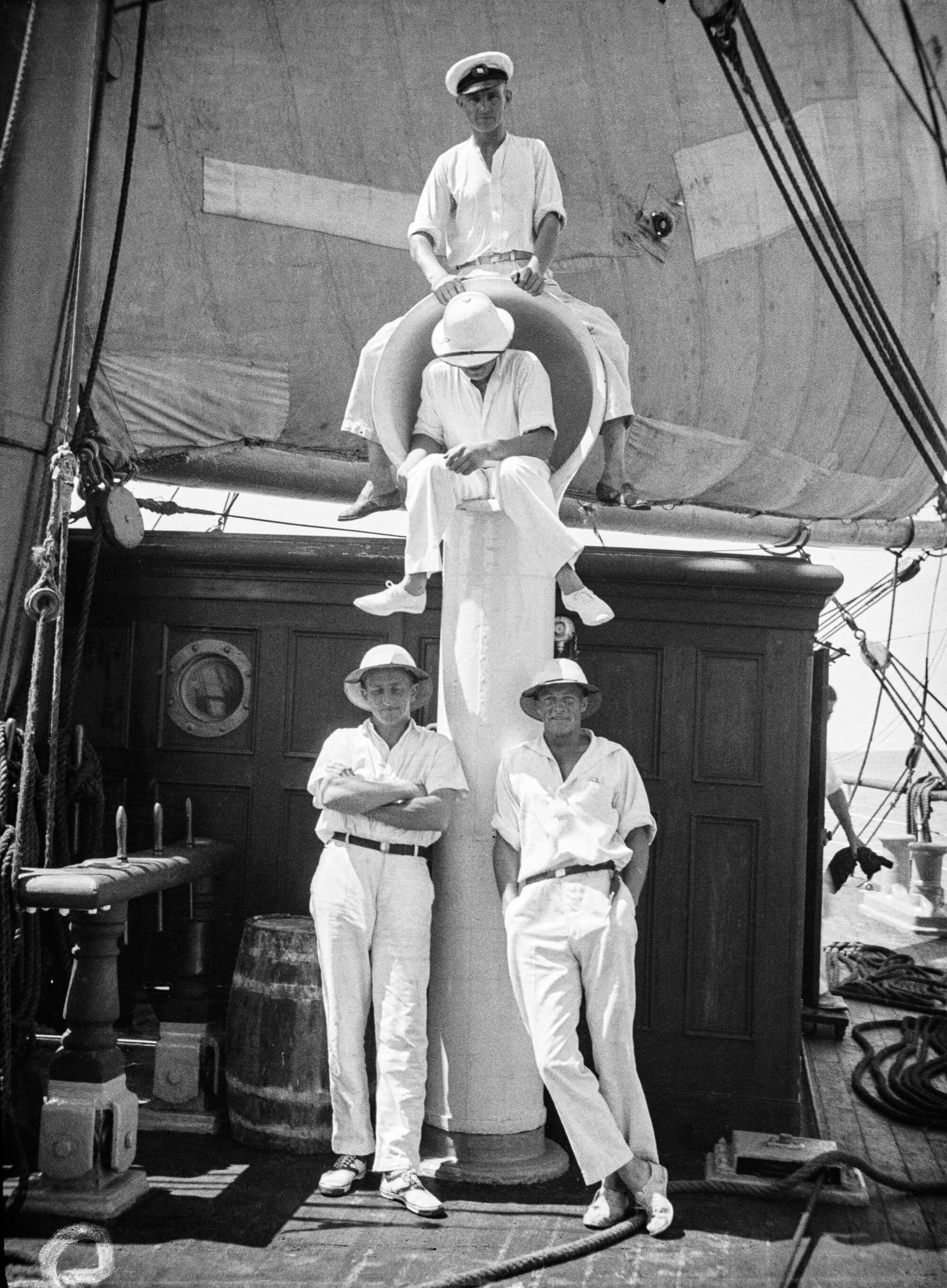 Bij het passeren van de windstille gebieden droegen de officieren witte uniformen en tropenhelmen. Op de foto poseert kapitein Sven Eriksson (rechtsonder) met drie van zijn stuurmannen. Op de windvanger zit stuurman ‘Mopsy’ (niet zijn echte naam). Over hem schreef Pamela: “We noemden hem allemaal Mopsy. Hij was nog te kort uit de fo’c’sle om veel autoriteit uit te stralen. Hij leek blij te zijn toen de passaatwinden kwamen en hij uit de wacht werd gehaald en de leiding kreeg over de dagploeg, die hij als slaven opjoeg om het schip spik en span te krijgen voor Europa.”